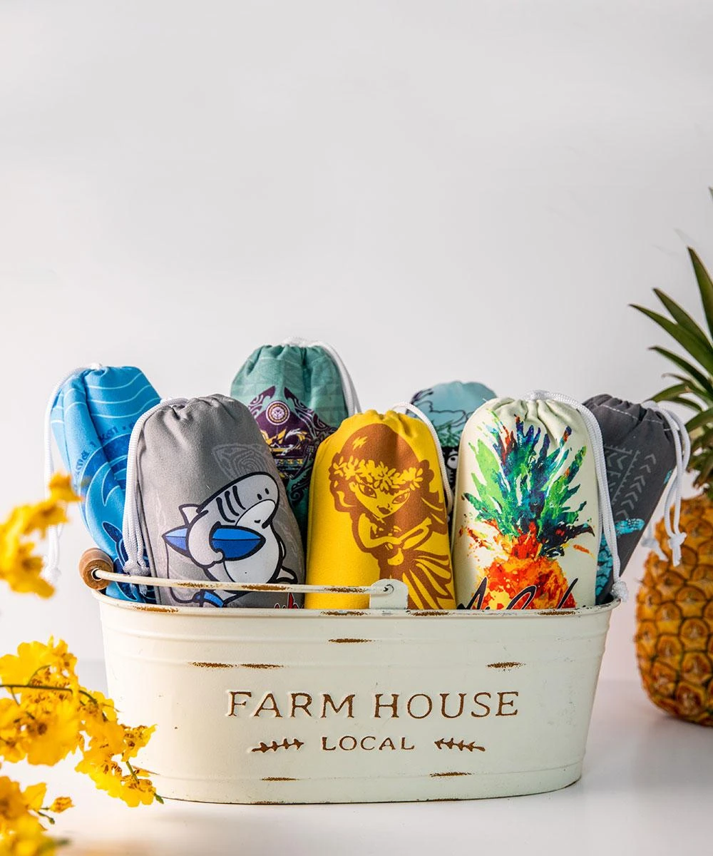Geckos are guardian spirits in Hawaiian lore. Like a true local, this cool cat looks like he is guarding his favorite surf break. This towel is made with plush microfiber material that’s oh so soft against your skin and dries super-fast so, when it’s time to leave, your stuff doesn’t get damp. Extra long and wide, it’s great for laying out and, unlike terry towels, it won’t trap sand so you’ll get less in your bag, car and home. It has great Crazy Shirts graphics and comes in its very own tote to make a day by the water even more fun and easy. Towel measures 63″L x 31″W. Printed pouch measures 6″L x 9″W