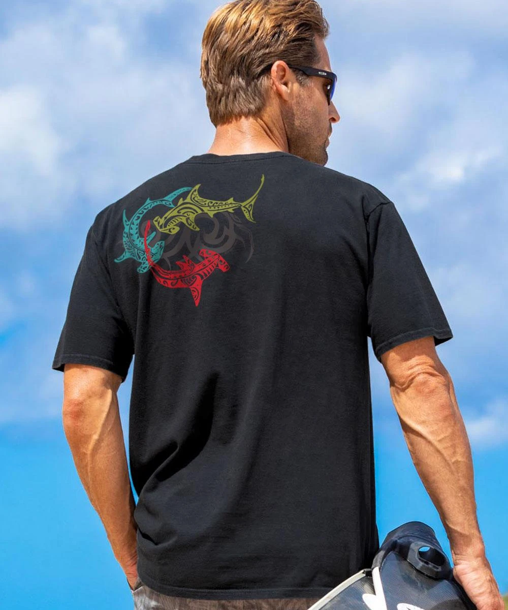 Hammerheads are known to roam up and down coastlines, and while the Great Hammerheads are usually solitary other species of these peculiar looking sharks have been seen in groups of 100 or more. With its swirling designs, this shiver of sharks captures the hammerhead’s ability to turn quickly and makes for one killer tee. Made from 100% cotton that is ring-spun then combed to remove impurities, this fabric is luxuriously soft and lightweight yet incredibly strong. We only use environmentally friendly water-based inks that penetrate the material’s fiber resulting in more vibrant colors, softer feel and artwork that doesn’t crack or peel. Plus, it is proudly printed in the United States for quality you can see and designs that stand the test of time.